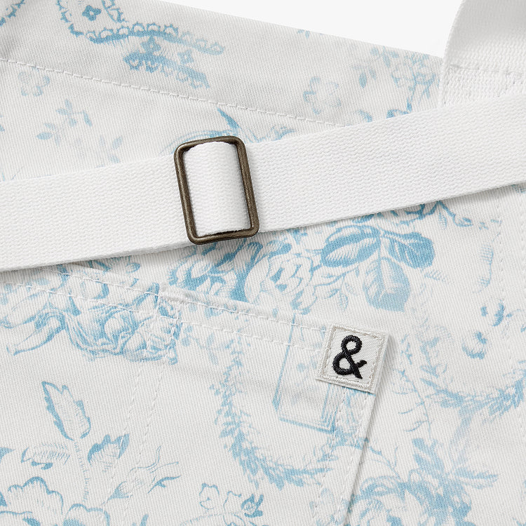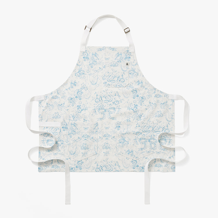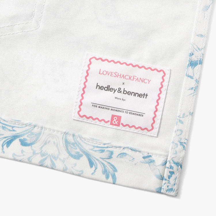 A dreamy toile print that evokes the French countryside, this serene blue cropped apron features romantic florals, cherubs, and birds. Inspired by 19th-century French textiles, the print was lovingly designed in-house, featuring LoveShackFancy's bow motif woven throughout. Includes H&B's iconic signature touches — a towel loop, pockets for days, and an adjustable neck strap. Made in Los Angeles.