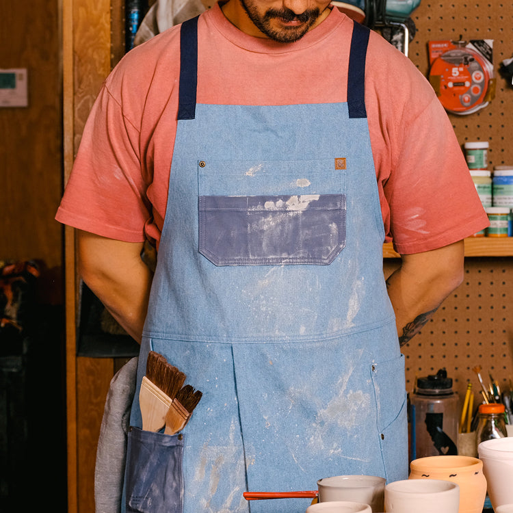 Meet the Maker’s Apron in rugged, classic Oak Denim—built for the crafters, potters, woodworkers, and creatives who need durability and design in one sharp-looking package. This split-leg apron was designed in collaboration with real makers to create something that works with you, not against you.