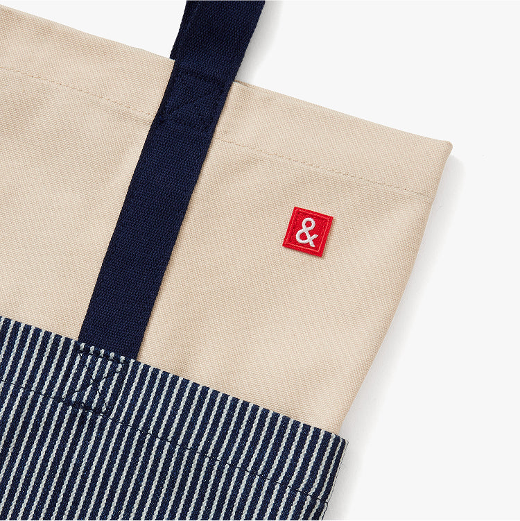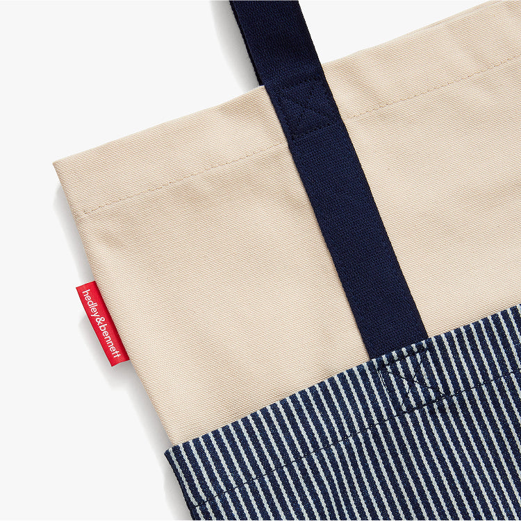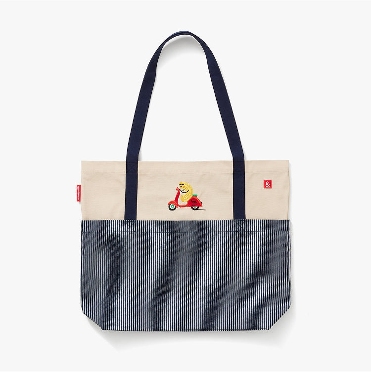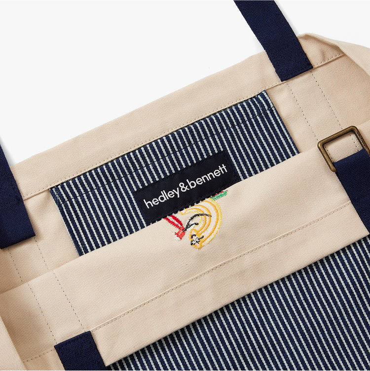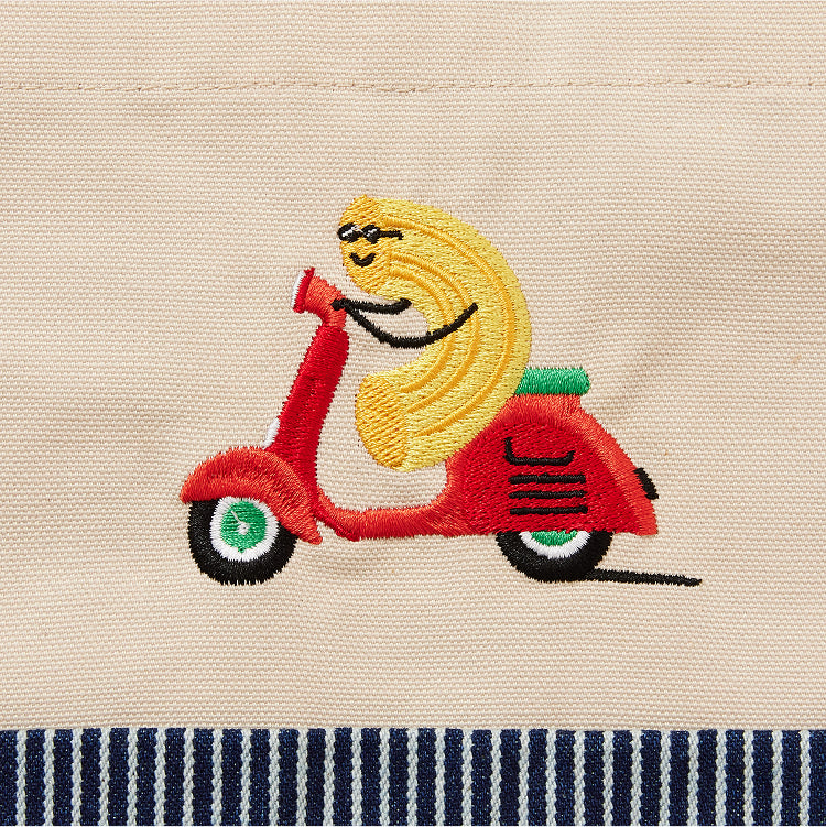 For the carb enthusiast on the go. This flat white canvas tote with a hickory denim bottom and sturdy navy straps brings a dash of pasta-night charm to your everyday carry. Its roomy main compartment is perfect for farmers market hauls or Sunday supper supplies, with an interior flap pocket for your phone or wallet and a brass D-ring for your keys. And front and center? Our cheeky macaroni on a Vespa joyride.