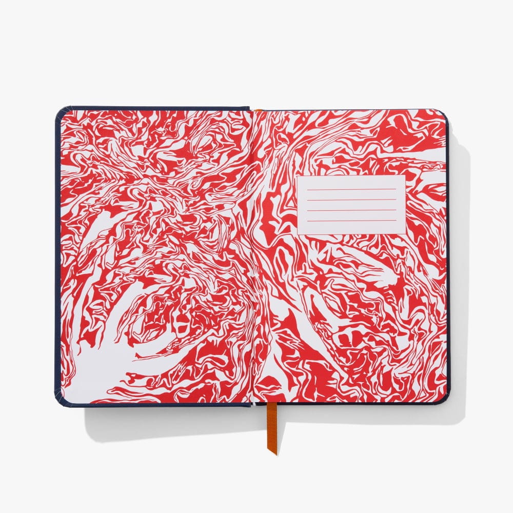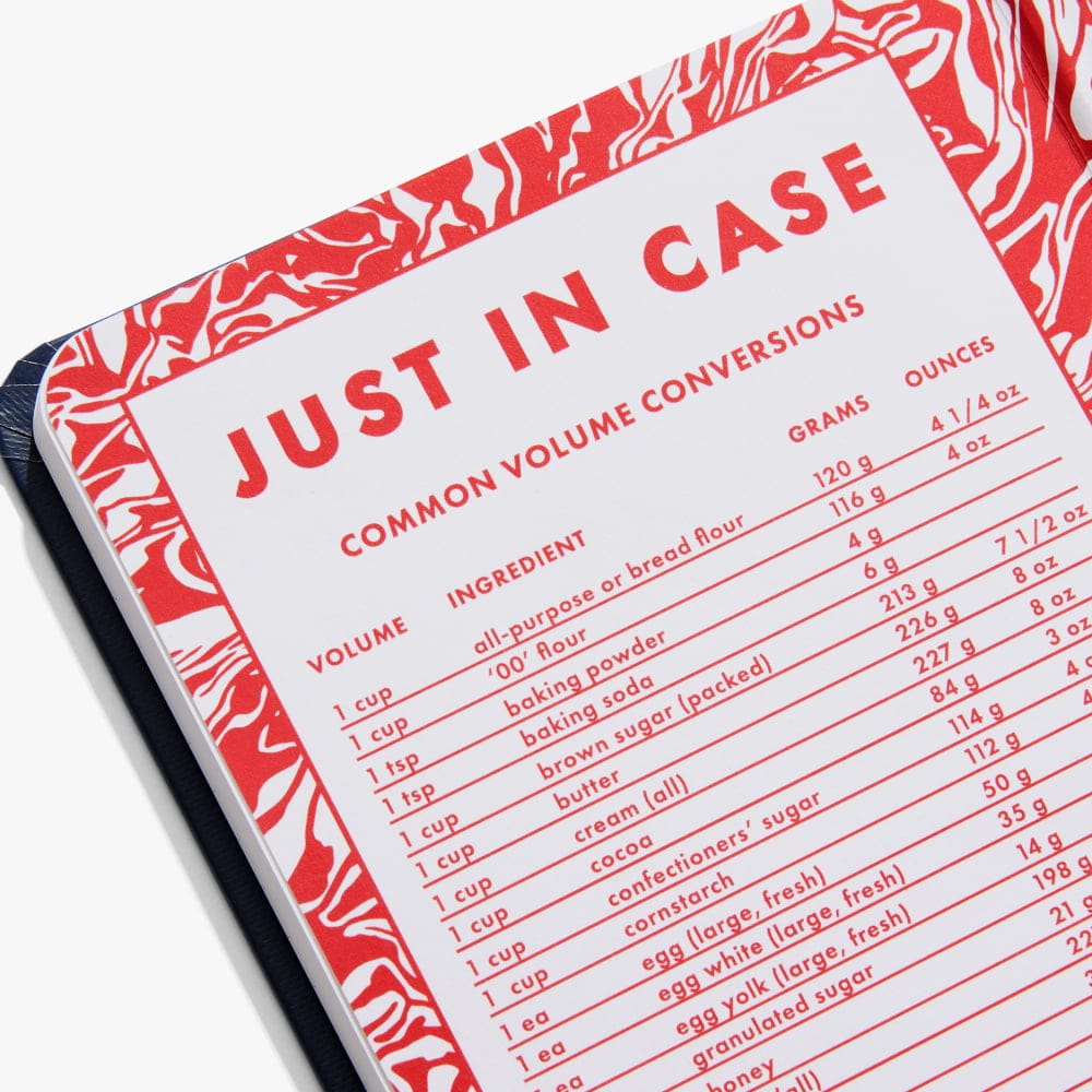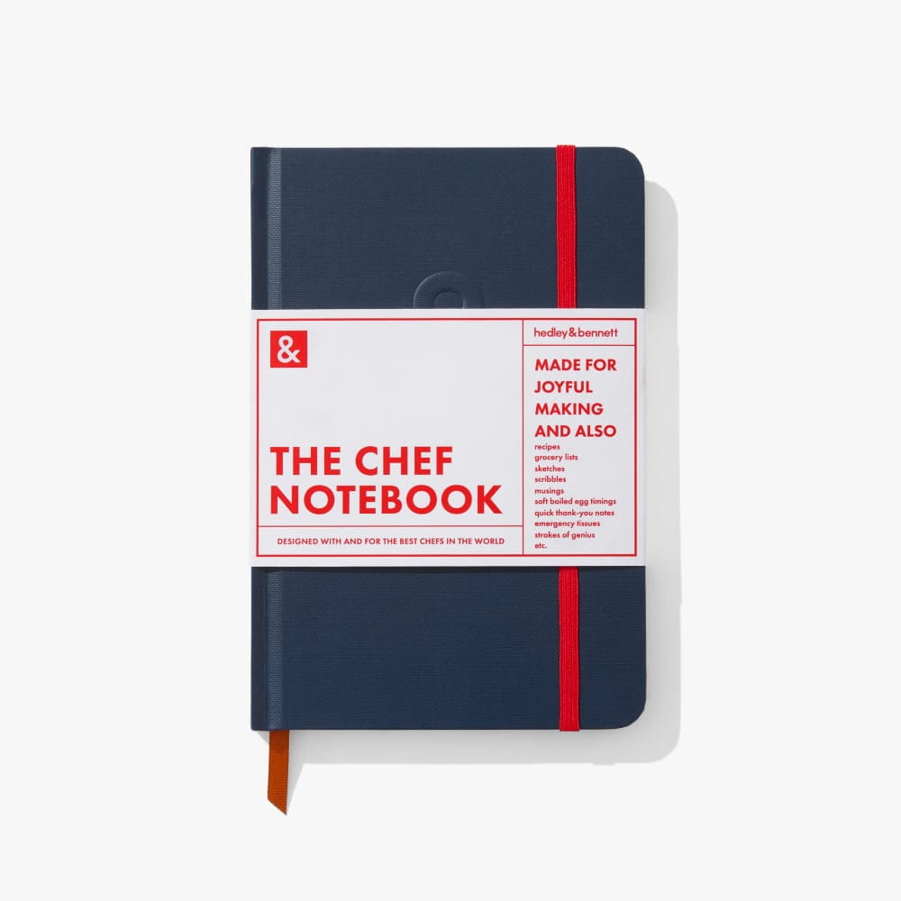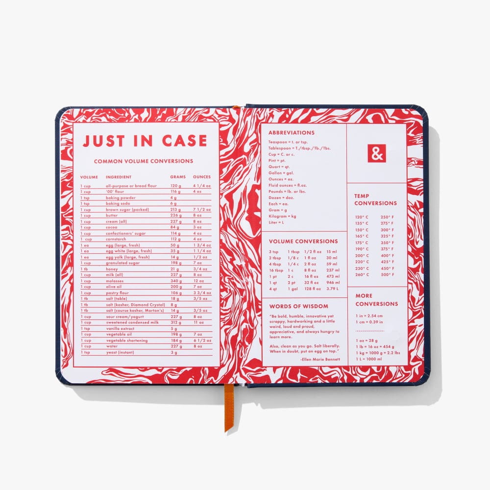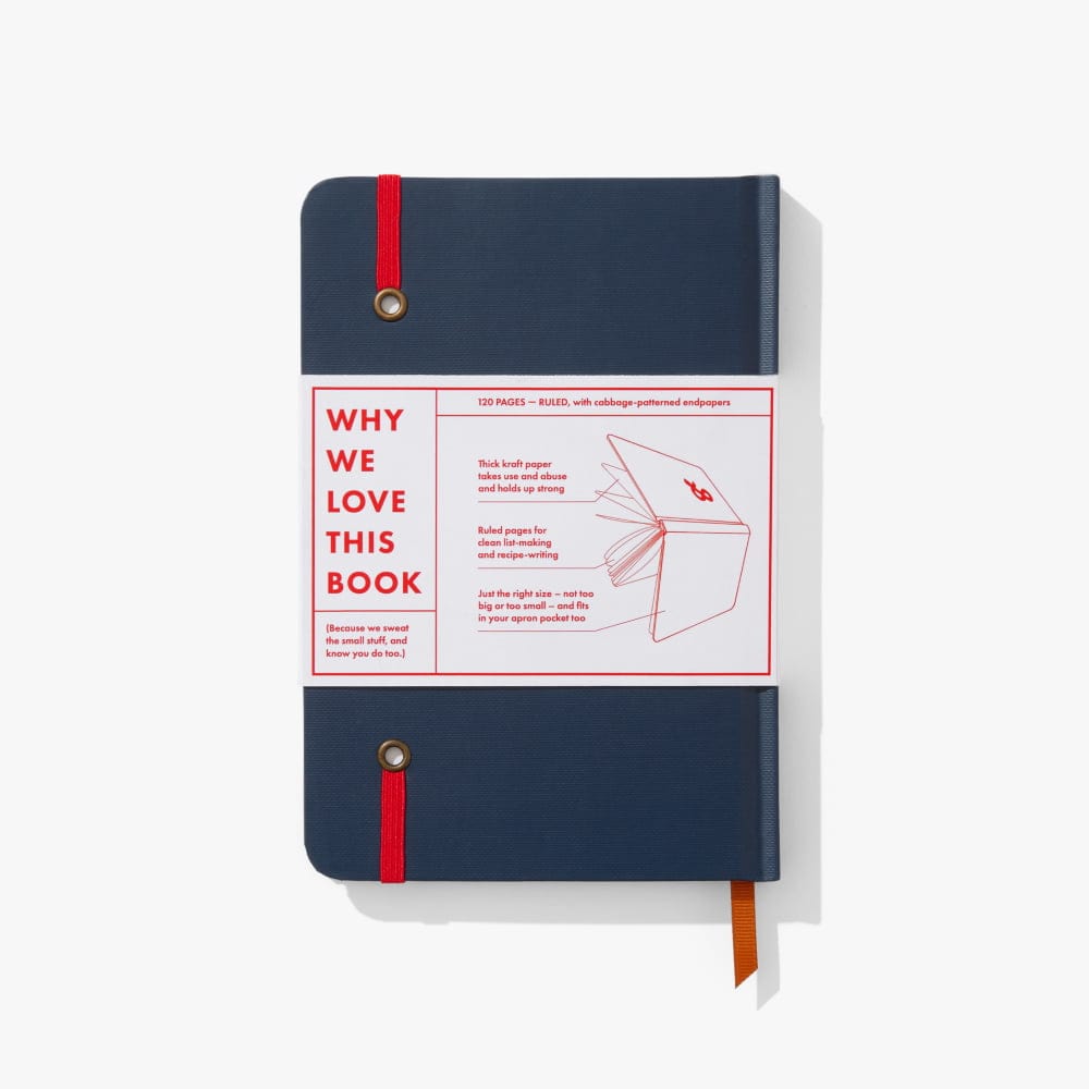 Introducing your handy-dandy, quality-made hardcover Chef Notebook, for recipes, grocery lists, sketches, scribbles, musings, emergency tissues, strokes of genius… choose your adventure. Includes cabbage-patterned endpapers and a common volume conversions chart because you can never be too prepared. 120 ruled pages, just the right fit for your H&B apron pocket measuring 5 ¼" by 7 ¾". Featuring brass rivets, an embossed ampersand, a red elastic enclosure, and a satin ribbon bookmark.