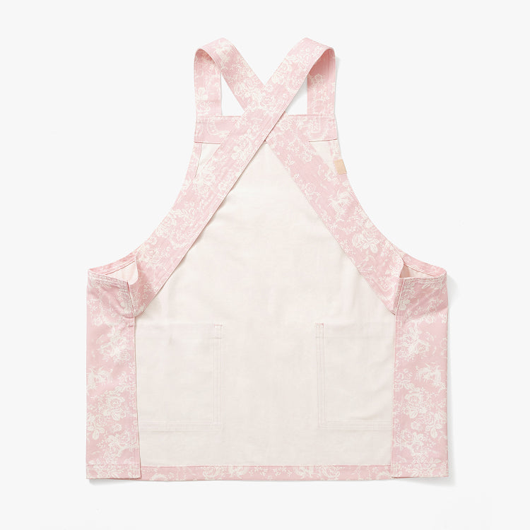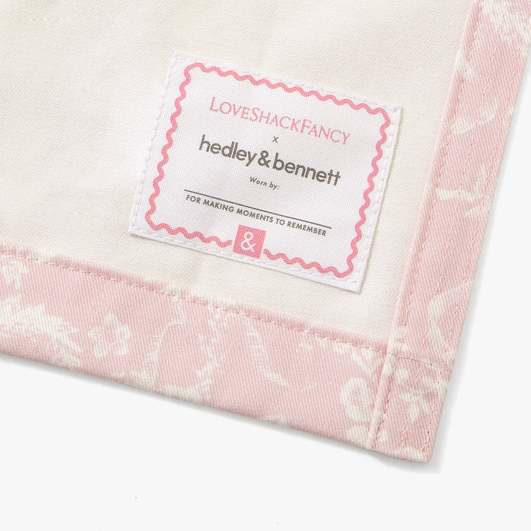 A dreamy toile print that evokes the French countryside, this perfectly pink smock features romantic florals, cherubs, and birds. Inspired by 19th-century French textiles, the print was lovingly designed in-house, featuring LoveShackFancy's bow motif woven throughout. Includes H&B's iconic signature touches — a towel loop, lap pockets, and criss-cross back straps for all-day comfort. Made in Los Angeles.