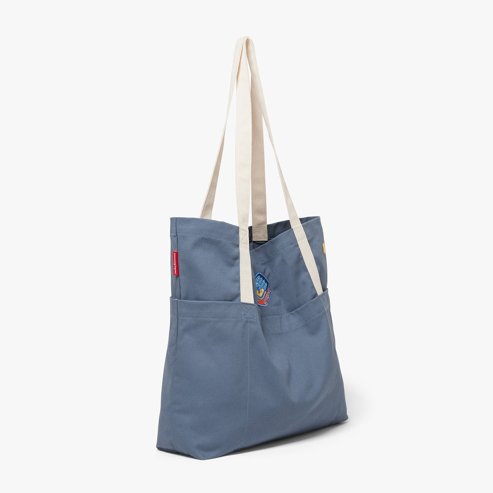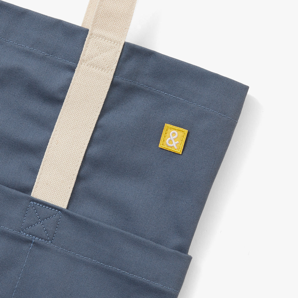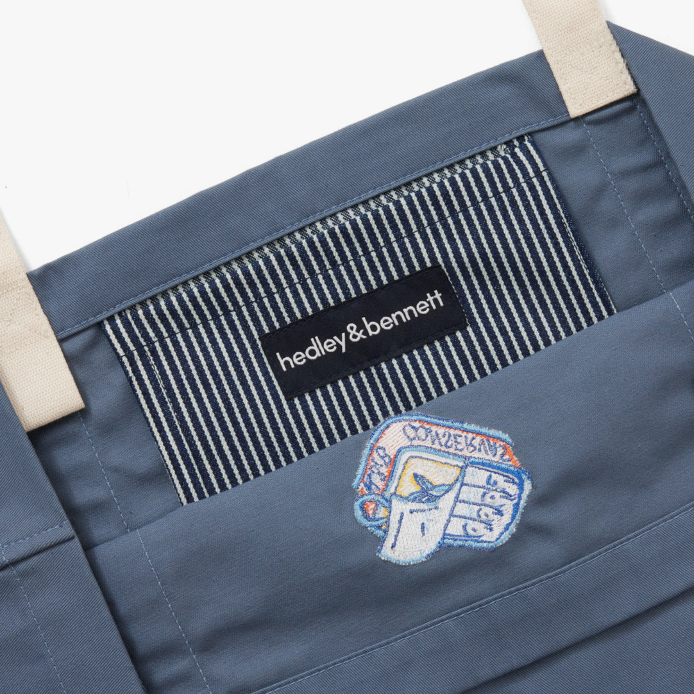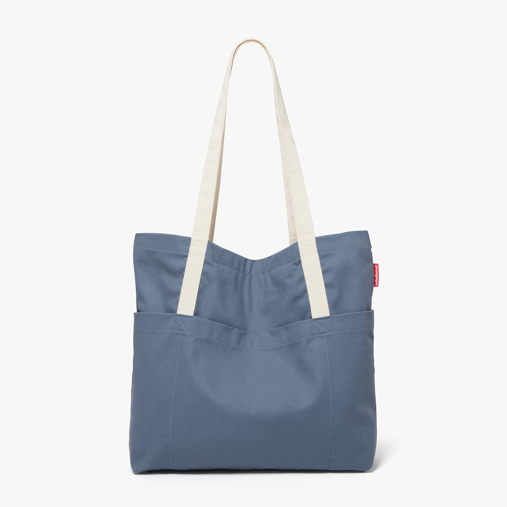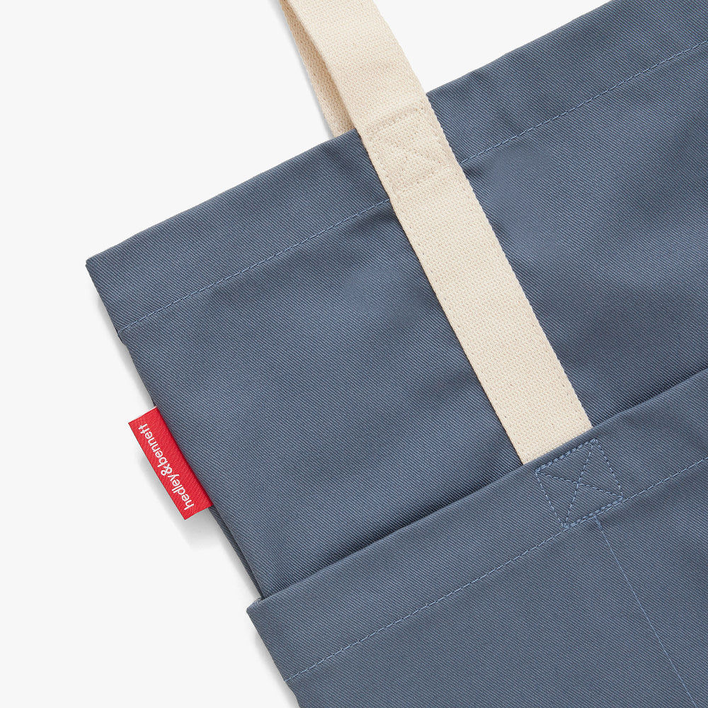 One fish, two fish, red fish, tinned fish.This slate blue body and cream strapped tote's extra-deep and voluminous main compartment has a handy interior hickory-striped flap-pocket for smaller items, plus a brass D-ring for your keys. But we're most excited about the four exterior pockets –– perfect for bottles of Bordeaux, a fresh baguette, or even a few tins of fish.